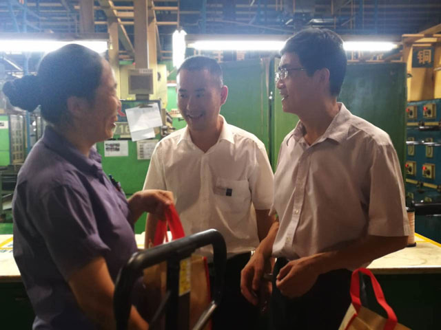 上午慰問(wèn)組到達工廠(chǎng)后在公司副總經(jīng)理方浩斌陪同下,第一時(shí)間到車(chē)間向正在緊張生產(chǎn)勞動(dòng)的一線(xiàn)員工開(kāi)展慰問(wèn),給員工們送上夏令用品。慰問(wèn)組每到一個(gè)車(chē)間都詳細詢(xún)問(wèn)工人在企業(yè)的生產(chǎn)工作和生活情況,了解職工在高溫環(huán)境中作業(yè)和身體健康狀況,當得知公司對員工在日常生活、健康保障、高溫補貼發(fā)放、夏季生活區、生產(chǎn)區所采取的各種降溫措施時(shí),章順德給予高度贊許。